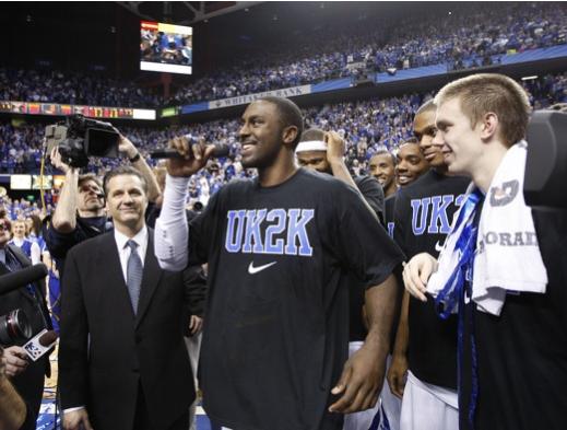 UK2K. Kentucky 88, Drexel 44. Kentucky jumped on Drexel early. By jumped on, we mean 23-5 to start the game. We mean a 56-20 lead at the half. One of the last buckets scored in the half was a John Wall behind-the-back drive to the hole that got the crowd up and put the gavel down on this one. The second half was an hour-long hernia examination for Drexel, complete with over 20,000 onlookers. John Calipari had pretty much cleared his bench by the 9:00 mark, not wanting to make it any worse for Drexel coach (and friend) Bruiser Flint. DeMarcus Cousins had yet another double-double with 18/13, most of which I think he had in the first six minutes of the game. Patrick Patterson also had 18 for the Wildcats but the story (again) was John Wall, whose 16 points and 7 assists had the crowd — and the TV commentators — mesmerized. The program’s 2,000th win was marked with a short ceremony after the game with Calipari acting as impromptu MC, with appearances by the son of Adolph Rupp, the wife and daughter of the late Bill Keightley (former equipment manager and beloved UK personality), and a short statement by Patrick Patterson, whom the players selected to speak on their behalf. In all honesty, this wasn’t so much a basketball game as it was a formality and then a party for the 2,000th win.
