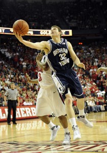 2009 February 21: Jimmer Fredette (32) Guard Brigham Young University Cougars NCAA Mountain West Conference (MWC) leans in and attempts an underhanded toss. Fredette scored 13 as BYU lost 74-75 to UNLV on Tarkanian Court at the Thomas and Mack Center in Las Vegas, NV.