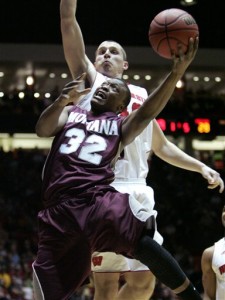 Montana guard Kareem Jamar (32) drives past Wisconsin forward Jared Berggren during the first half of an NCAA tournament second-round college basketball game Thursday, March 15, 2012, in Albuquerque, N.M. (AP Photo/Jake Schoellkopf)