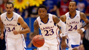 LAWRENCE, KS – NOVEMBER 15: Ben McLemore #23 of the Kansas Jayhawks moves the ball upcourt supported by Perry Ellis #34 and Travis Releford #24 during the game against the Chattanooga Mocs at Allen Fieldhouse on November 15, 2012 in Lawrence, Kansas. (Photo by Jamie Squire/Getty Images)