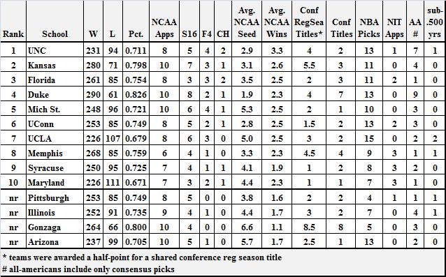 Defending Our Methodology. One of the more interesting things about releasing these rankings has been the reaction from various fan bases. Some have been very measured in their response and criticism (such as the people in Lawrence, Kansas) while others have been a little more vitriolic (fans of another program in the center of the country). Most of the criticism has been directed at our methodology. There seemed to be quite a bit of confusion on this, so let’s clear it up immediately. Some people have misinterpreted our table (below) as if the listed criteria were all considered totally and equally in how we ranked teams. Nothing could be further from the truth – rather, the table was intended to be used as a tool showing the universe of relevant statistics that our panel might find useful when making their decisions. There was no formula that a panelist was obliged to follow – instead, each panelist had complete discretion to consider or ignore any statistic he deemed important (or irrelevant). Once each panelist submitted his list, we then took a holistic view of the world when determining where to rank certain teams. Obviously we all considered winning percentage, NCAA Tournament success, conference achievements, etc., but in varying degrees. That’s what makes these debates work – while one panelist may think that the NCAA Tournament is all that really matters and wants to weight teams almost exclusively on that metric, another panelist may want to give more substantial weight to the regular season. Here’s the thing, though – reasonable minds always differ, and both conclusions are completely ok. We believe that this sort of subjective analysis – review the available stats, pre-rank a list, reconvene to discuss, finalize the rankings – gives such a ranking system more credibility than simply weighting and re-weighting a formula until everything “feels” right. For those of you who wanted a completely “objective” ranking system… well, here’s an example we did last spring that shows how the BCS formula would have applied to the NCAA Tournament. Hint: F4 participants Villanova and UConn wouldn’t have even been invited to the Ball. In sum, we think that our methodology resulted in a solid, defensible list of the top ten programs of the 2000s. Not everyone can be happy, but we’re comfortable with the results.