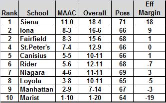 Standings and tempo free breakdowns (courtesy of Basketball State). Only MAAC games are computed. Efficiency margin is the difference between offensive and defensive efficiency. Like a checking account, positive is good, negative not so good.