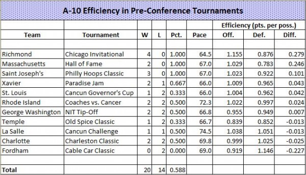 Richmond’s run through the Chicago Invitational field included a 65-54 win over #11 Purdue, but the conference co-favorite Temple squandered opportunities to garner positive national attention when the Owls dropped games to Texas A&M and California at the Milk House in Orlando. Xavier advanced to the finals of the Paradise Jam, but fell 67-58 to tournament winner Old Dominion. Saint Joseph’s collected the conference’s other tournament trophy when the Hawks beat Rutgers in the finals of the Philly Hoops Classic. The Philly Hoops Classic has undergone several format revisions over the tournament’s four0year history, the number and locations of the preliminary round games has changed nearly every season, but that each member of the city’s Big 5 takes a turn hosting the event has not changed.