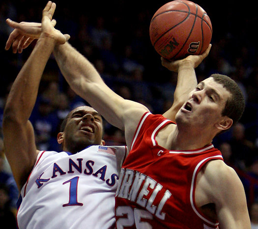 The (Big) Red Scare. #1 Kansas 71, Cornell 66. Normally, an early January game between a top-ranked Kansas squad and…well, pretty much any Ivy League school sounds about as thrilling as getting the measles twice. Tonight was different. Cornell came into Kansas’ dreaded Allen Fieldhouse already with a few wins over big-conference teams like Alabama, Massachusetts, and St. John’s. They were riding the momentum of a ten-game winning streak and could boast a kid in Ryan Wittman who is nothing close to a kept secret any more. Wittman (24/4/3 assts), a 6’6 long-range bomber averaging 19 PPG and 44% from distance, had appeared on various “best outside shooters” lists (including ours) and already had people wondering if Cornell was actually good enough to get in as an at-large team this year. But this is no ordinary place or opponent. This is Kansas, and this is Allen Fieldhouse, they of the 50-game home winning streak and current #1-ranking that, to be honest, hasn’t really been challenged yet. It was close from the start; neither team led by more than three in the first half, and Cornell actually led at the break by that margin. You still had the feeling, though, that this was one of those games in which Kansas would come out in the second half and end it early. We’ve all seen this game before, right? A team hangs around for a half by playing the best 20 minutes of basketball they’ve ever played, like Mike McD thinking he’s going to complete his run on Teddy KGB’s place. We all know it’s a matter of time until Kansas turns over the two aces and sends whatever upstart they’re facing back to law school, a bratty Gretchen Mol, and Joey Knish’s delivery truck, right? But when Cornell jumped on the Jayhawks to start the second half and extended their lead to eight, panic began to take root. With Kansas up 53-47 with 9:45 left, the calls, texts, and more frequent network updates started. When Kansas had still failed to reclaim the lead with under five minutes left, it was on. Upset alert. #1 is in trouble. And it’s an Ivy League team. I mean, come on — ESPN even broke off of a DUKE GAME to provide bonus coverage! Kansas, elevated by the home crowd, would eventually break free from Cornell’s expert control of the pace and take a 61-60 lead with 4:03 left, and you got the feeling that Cornell was done. They would actually take the lead once more at 64-63 with less than a minute left, but Sherron Collins decided it was time to take over. Handling the ball almost exclusively for Kansas, Collins (33/4/3) scored his team’s last eight points and four out of five FTs down the stretch. Give Cornell credit for going for the kill, though. Down 66-64, they found Wittman off a screen with 29 seconds left and he was never thinking about a two. He would miss that three, and a later one to tie, and Kansas would eventually prevail. This was probably the worst thing that could happen to the rest of the Big 12, since now Kansas has learned (if they weren’t aware before) not to take their position for granted, and they know there’s no such thing as a night off. Coaches secretly love these close games early in the season because it empowers and tempers your squad, making them tougher for eventual tournament games. As for Cornell…if the committee still considers “quality losses,” it doesn’t get much more quality than this one — to #1 Kansas, in their house, a 50-game home win streak on the line. The Big Red will probably gain Top 25 votes from this, and it should actually help their curb appeal. So, hands up, who wants to see Cornell opposite them as a first round opponent on Selection Sunday?? Yeah, we thought not.