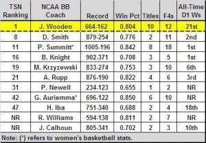 By now you’ve probably seen the list published earlier this week by The Sporting News naming their Fifty Greatest Coaches of All Time, across all sports. And most likely you’ve at least seen that the legendary John Wooden tops that list, a selection about which this blogger has not heard one single detractor, not even one with a bad argument. What’s interesting to me is the names from the college basketball world that follow Wooden on that list. Here they are; I added two coaches at the end who did not make the TSN list (though one would think they might) just for the discussion: