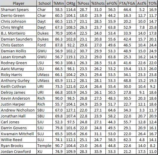 I wanted to keep the list to 1-2 players per team at most, but a few teams/player combinations posed a challenge. Charlotte, Duquesne and La Salle are cases in point. Charlotte’s freshman Chris Braswell will most likely make the short list for the All-Conference Newcomers team, but his 24.8% possession rate was probably inflated by his 26.5 turnover rate. His 98.3 offensive rating (about 0.98 points per possession), though low for a “go-to” type player, is typical for a freshman. Braswell may well find the ball in his hands at a crucial juncture of a few of Charlotte’s games this season, but Green and Spears will probably have to pass on their shots first. La Salle’s junior forward, Jerrell Williams, also had a high possesion rate (about 24.4%), but took relatively few shots, 18.6%, more typical of a role or basic “starter”, rather than a go-to type player. The difference between possession and shot rates may be explained by Williams’ outstanding offensive rebounding rate (15%) and FTA/FGA rate (about 90%). Duquesne’s Malquan Bolding has been out with a broken wrist, injured in the Dukes’ first game of the season. His offensive role may well have passed to guards Bill Clark and Eric Evans. Bolding logged an offensive rating of 102.7 by the end of the 2009 season, an efficiency mark Evans (79.7) and Clark (99.5) have been unable to achieve, though both were more efficient last season than this. Which may explain in part why the Dukes have been tagged with four losses so early in this season. The last two, a road loss to Summit League member UIPIU and a blowout in Morgantown at the hands of West Virginia, have to be especially damaging to Duquesne’s postseason expectations. Temple’s Lavoy Allen takes even fewer possessions just below “Regular” (or Pomeroy’s new descriptor “Significant Contributor”), but any team taking on the Owls has to account for Allen’s board work, under both baskets, and his efficienct conversion rate (52% eFG%). Richmond’s David Gonzalvez logs 82% of the minutes, takes 21.3% of the shots and converts at a very efficient 59.8% (eFG%), but possessions, and even shots when compared to Anderson (and Harper when he is in) suggest those two get looks before Gonzalvez. Too bad, given that his offensive rating is an outstanding 117.4 (100.0 is good). If he could develop consistency, game-to-game, Coach Mooney would probably figure out how to get him more looks and shots.