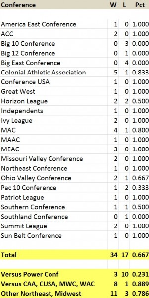 Conferences not played have been omitted. A few oddities should catch the reader’s attention. First, only Saint Bonaventure has engaged a MAAC school so far, unusual for the conference. The Metro Atlantic Athletic Conference is largely made up of private colleges (many of them Catholic) located in a footprint that stretches from the Capital Region in New York State, west to Lake Erie and south through metropolitan New York down to Maryland. Many MAAC schools share basketball traditions with Fordham and St. Bonaventure, and many of the other A-10 members from New England and Philadelphia. Second, the A-10 is killing the CAA this season, notching a 5-1 record so far. Granted less than a third of the scheduled games have been played, but A-10 teams had to close with a rush of wins to bring last season’s head-to-head record to 7-10, and conference fans watched with mixed emotions as the second CAA team in four seasons advanced to the Final Four last March. While only George Mason from among the CAA’s elite teams has been engaged (and GMU squeaked by, beating Rhode Island in overtime), the early returns are promising. The winning percentage against the power conferences is much lower than last season’s 0.469, but again the season is early as the conference has completed only 20% of their anticipated slate. Excluding the ACC where the A-10 holds a 2-0 edge so far, the conference’s only other power conference win came Sunday against Washington. While the lopsided record compiled against the CAA is the largest influence in the composite record, the A-10 has compiled an 8-1 record versus conferences with a similar profile (the CAA, CUSA, MWC, WAC and MVC), conference teams have sustained winning records against MWC and CUSA competition as well as the CAA.