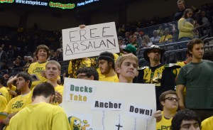Fans, this horrible week is over. You’ve been freed, just like Arsalan Kazemi. (Also, can we please ignore the fact that a UO student misspelled “anchor”? I got my degree from there, and so did this photographer, and neither of us seemed to have any issues with that word.) (Photo by Rockne Andrew Roll)